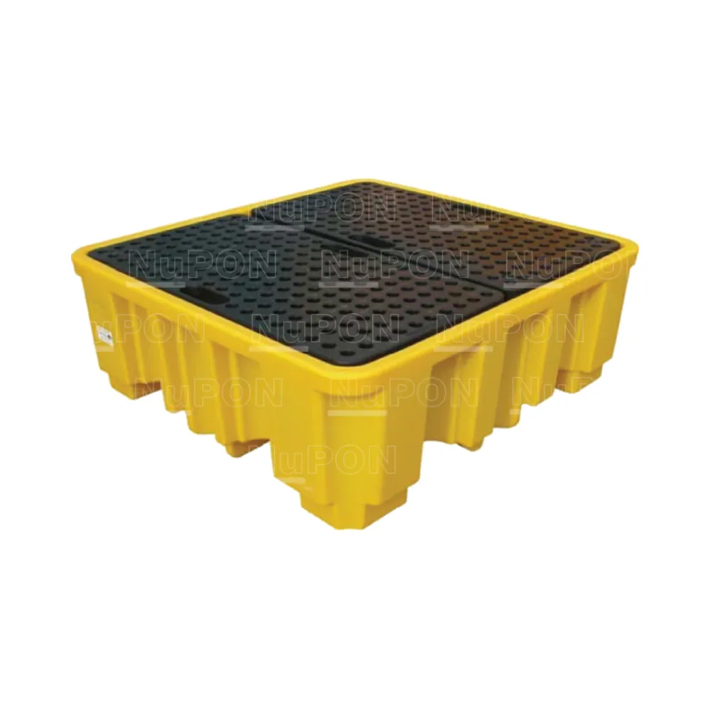 - 2 and 4 Drum Spill Pallet is made with durable quality polyethylene with removable platform. Spill pallet is used only for static spill containment, drums need to be removed before transported with forklift. Product is compatible with most forklifts and pallet trucks. Capacity meets European, UK, and US regulations. Fully recyclable, chemical-resistant, UV-protected polyethylene.